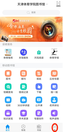 登录歌德手机客户端:点击登录,在地区选择“天津市”,“天津体育学院”,输入借书证号,密码默认1111。