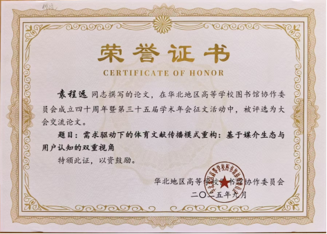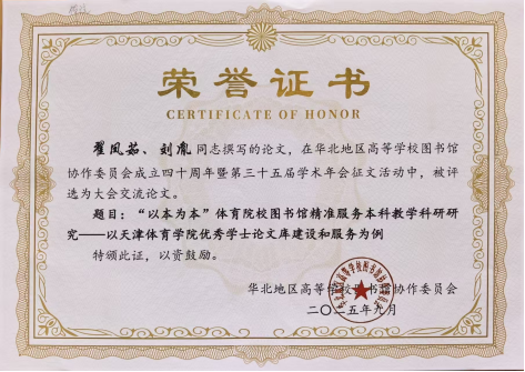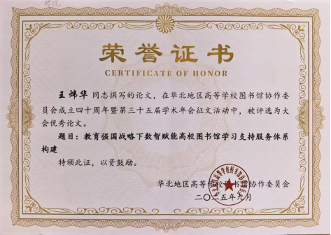 近日,华北地区高等学校图书馆协作委员会第三十五届学术年会在天津市召开,我馆馆员王炜华的论文荣获会议优秀论文,刘胤、翟凤茹、张婕、袁程远四位馆员投稿的论文分别被评为大会交流论文。
