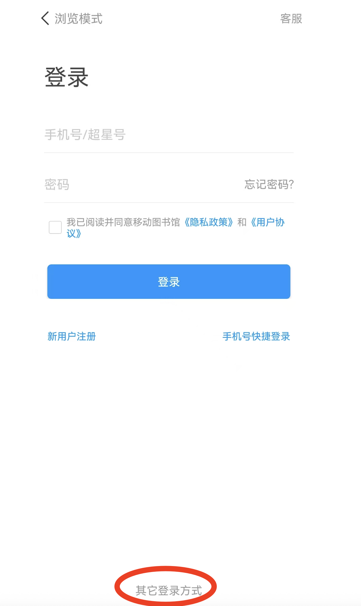 1.打开“超星移动图书馆”,在登录页面最下方,点“其它登录方式”,跳转到“机构账号登录”页面。