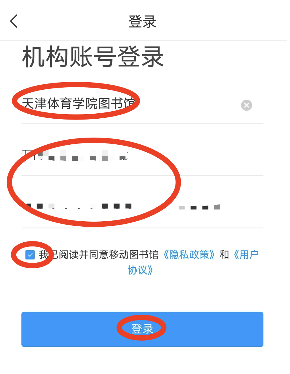 2.在“机构账号登录”页面,依次填写单位名称、进行借阅证号绑定,之后点“登录”。