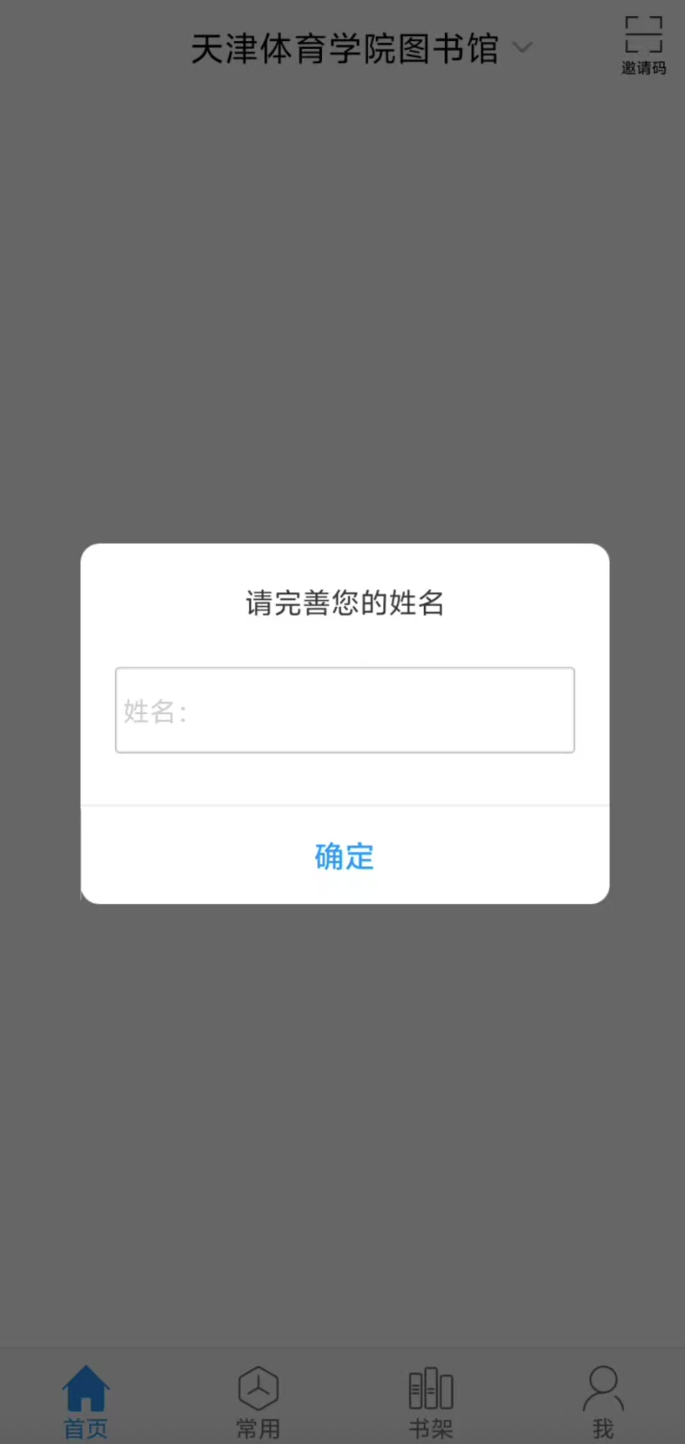 3.登录后,请完善自己的姓名,点“确定”后,就进到“天津体育学院图书馆”页面啦!