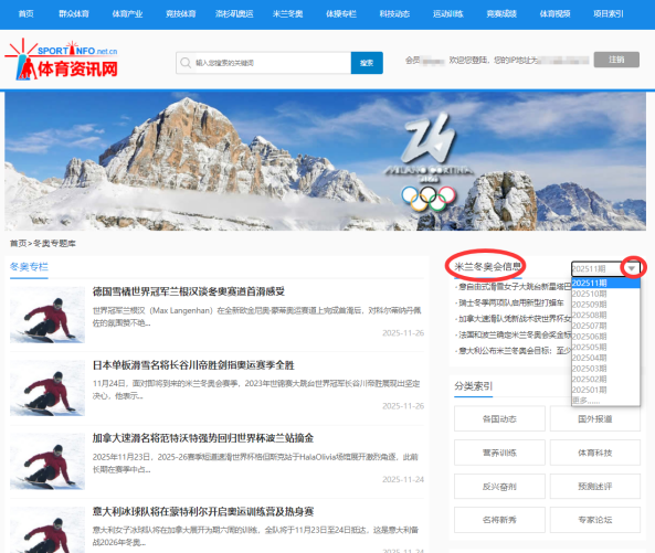 页面右侧是《洛杉矶奥运信息》和《米兰冬奥会信息》刊物入口,可通过下拉菜单选择期数。