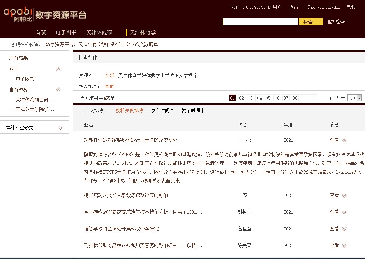 天津体育学院优秀学士学位论文数据库是由图书馆主持,历经两年建设完成的天津体院教育教学课题成果,该数据库涵盖教育学、理学、医学、艺术学、管理学、文学6个学科门类,17个本科专业,共收集2004年至2025年优秀毕业生论文455篇,具有较高的教学和科研参考价值的自建特色数据库,是反映我校本科教学水平的宝贵数字资源,对帮助本科生确定毕业论文选题方向, 规范论文写作,有较强的指导作用,欢迎广大师生使用。