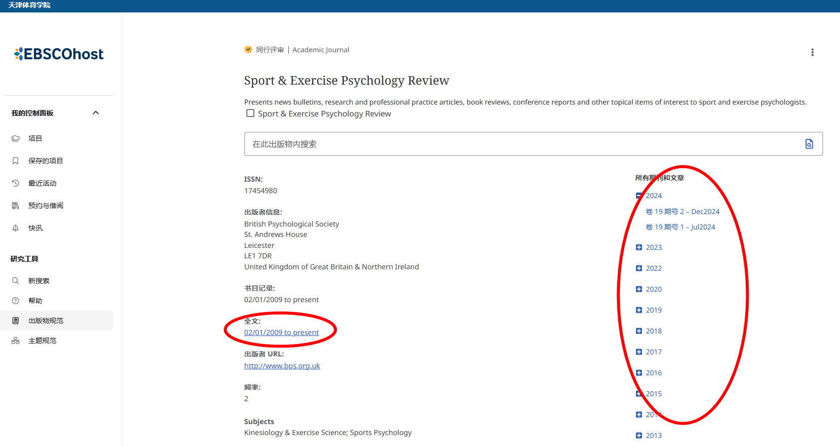 对于全文期刊,在出版物详情页面,既可以看到全文收录年限,还能通过右侧“所有期刊和文章”分类导航选择相关出版年和期数查看全文。