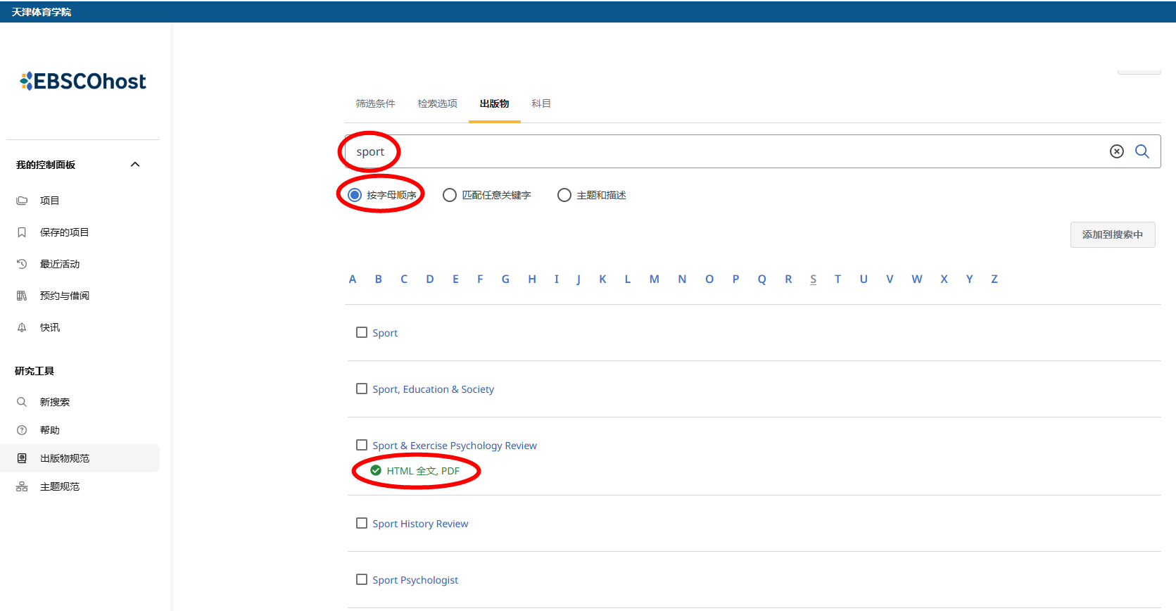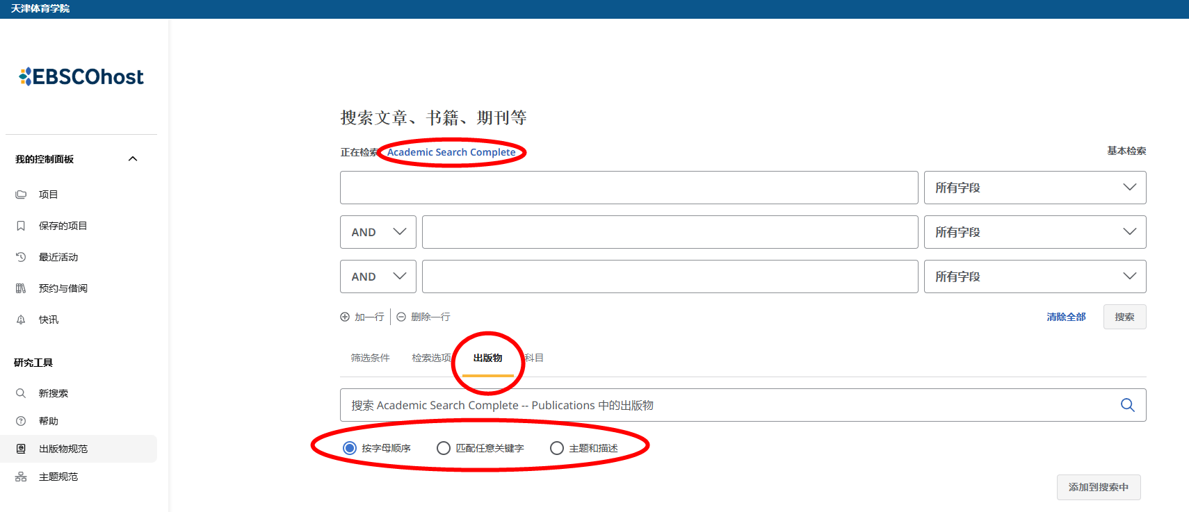 EBSCO升级到新用户界面,出版物检索的位置变化了,小伙伴们有没有找到新入口呢?以Academic Search Complete(ASC)综合学科学术文献大全库为例,可以看到,入口调整到高级检索下方了。但依然可以通过“按字母顺序”“匹配任意关键字”和“主题和描述”三个检索途径实现出版物检索。