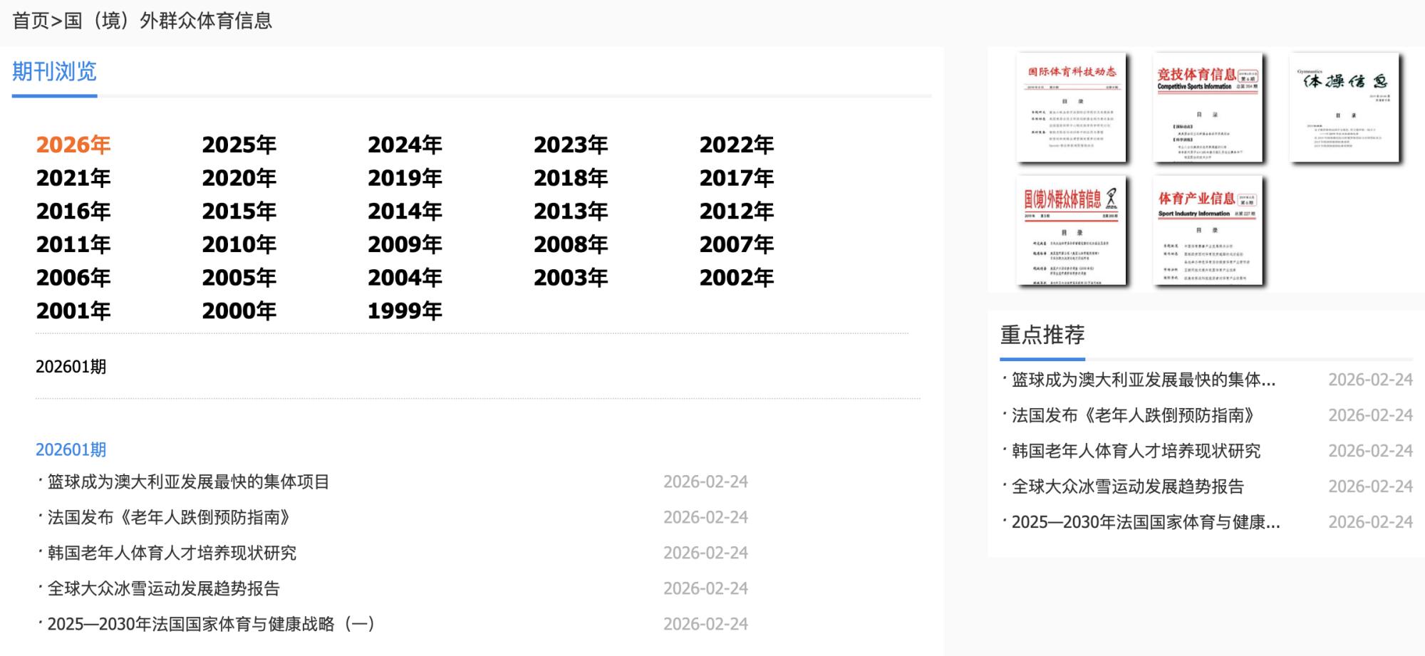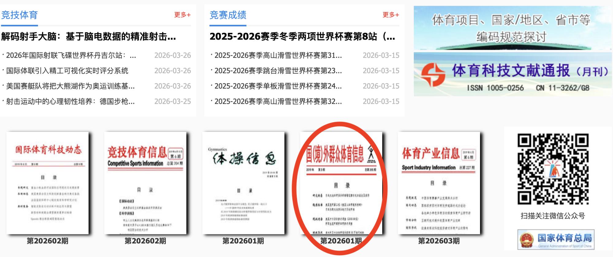 在中国体育资讯网首页,滑动页面到最下方,可直接找到《国(境)外群众体育信息》刊物入口。