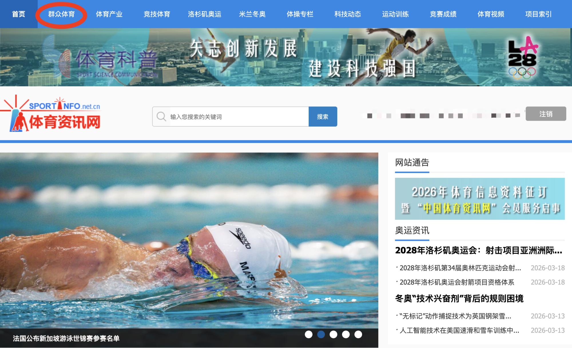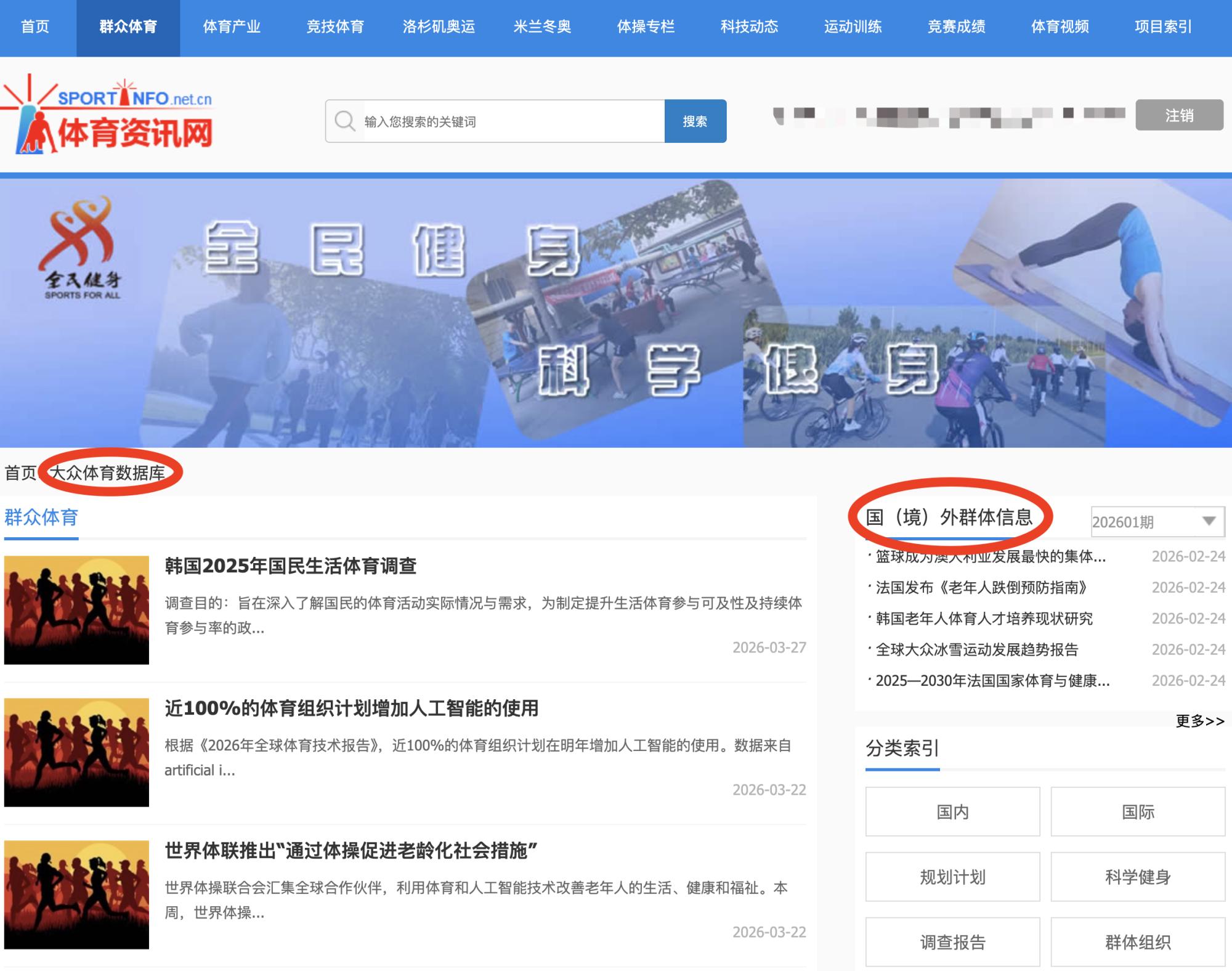 中国体育资讯网是国家体育总局体育信息中心建立的专业体育信息研究网站,包含多种信息刊物和数据库。其中的《国(境)外群众体育信息》(双月刊),主要刊载国(境)外大众体育政策、老年人体育、妇女体育、青少年体育、社区体育、国民体质监测、社会体育指导员、大众体育科学研究、大众体育经费与场地等保障措施、体育活动等方面的文章,信息量大、资料丰富、数据翔实,配有大量案例介绍,是群众体育管理与科研不可多得的信息来源。