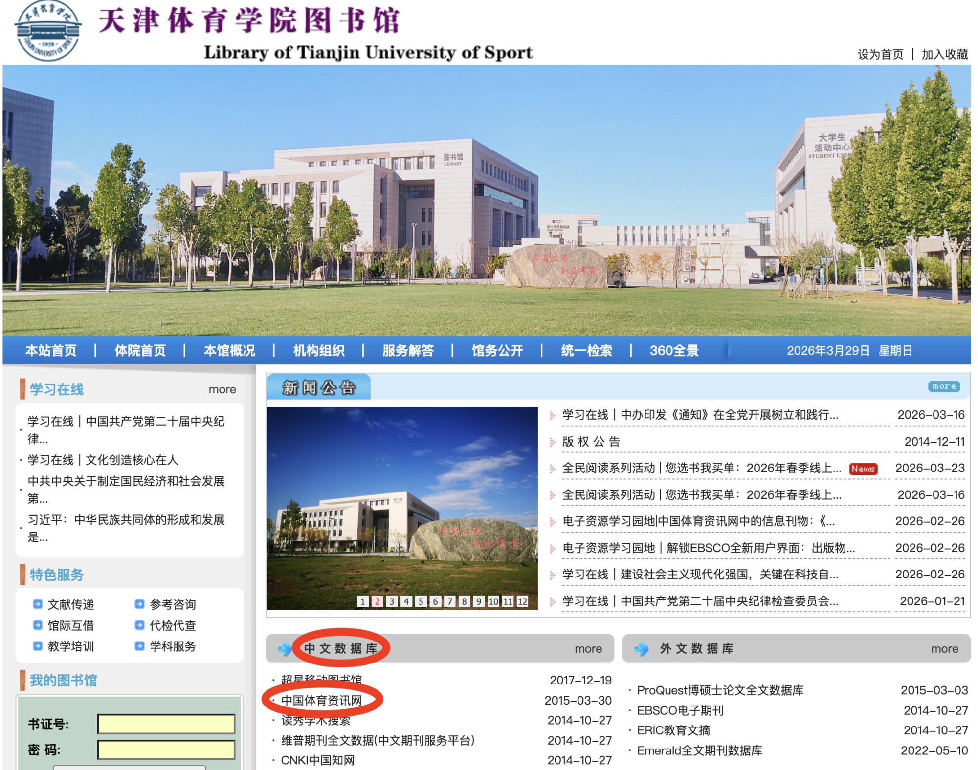 中国体育资讯网访问路径:图书馆官网——中文数据库——中国体育资讯网。