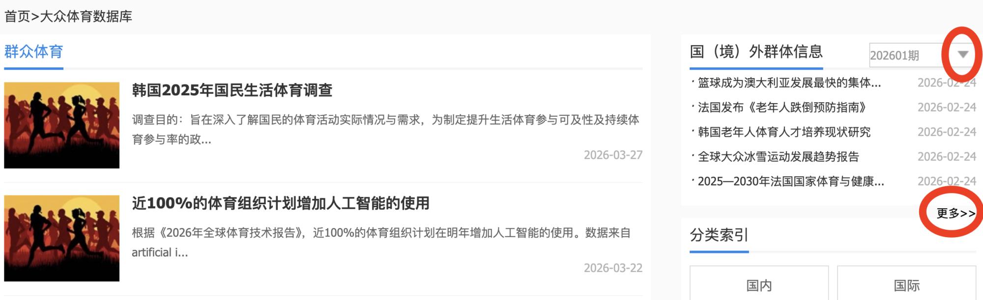 此外,在数据库主页,还可通过“群众体育”分类导航,链接到“大众体育数据库”页面,在页面右侧,找到“国(境)外群体信息”,也就是《国(境)外群众体育信息》刊物。