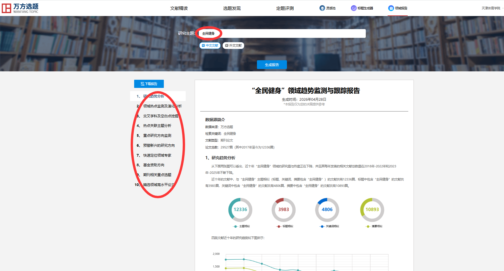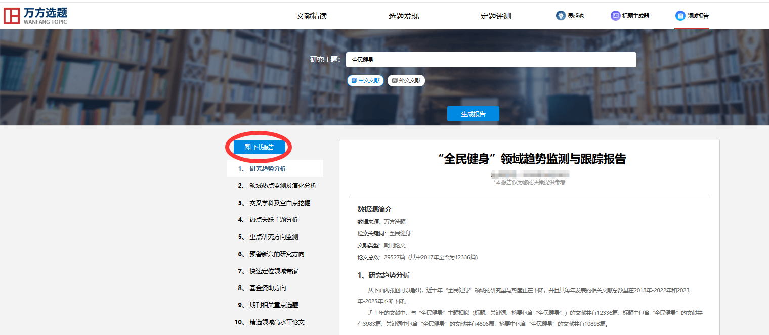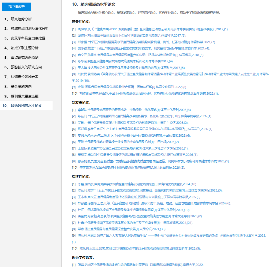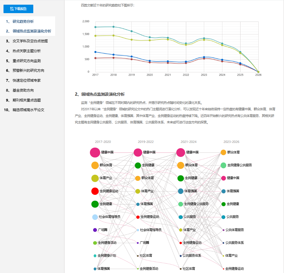 以“全民健身”研究主题为例生成报告。可以看到,报告提供了多指标和维度的分析,并通过各类可视化知识图谱详细解读,还能链接和下载领域高水平论文。