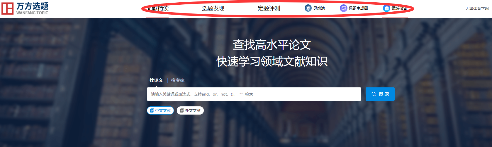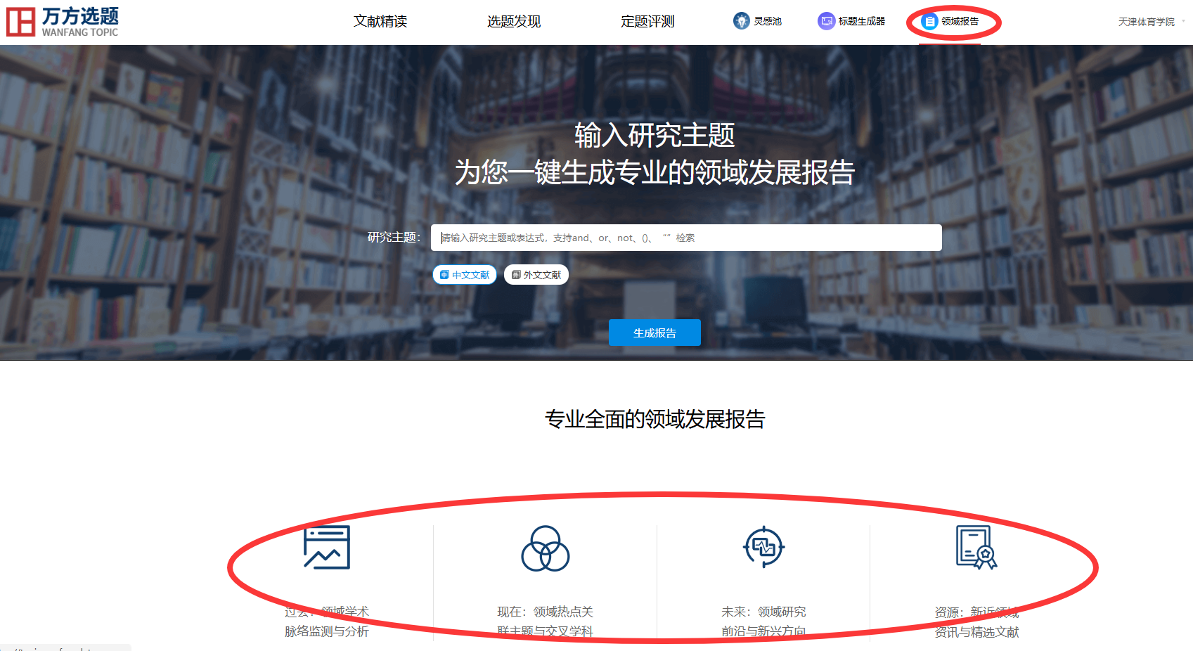 在数据库首页导航栏处,可以看到,万方选题通过文献精读、选题发现、定题评测、灵感池、标题生成器、领域报告多种方式提供选题帮助。